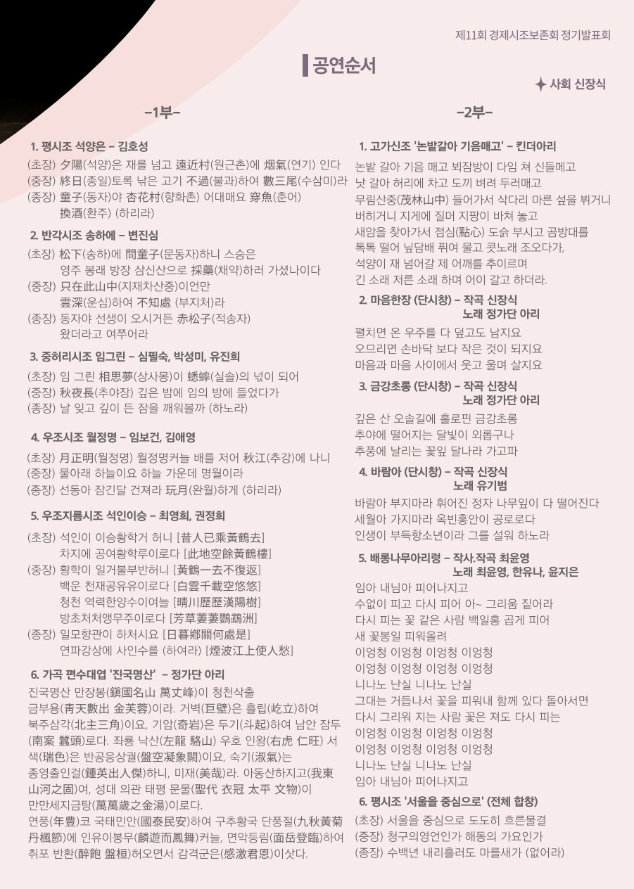 | 서울특별시무형유산 제47호 경제시조 공개행사 제14회 경제시조보존회 정기발표회 (0) | 2024.07.02 |