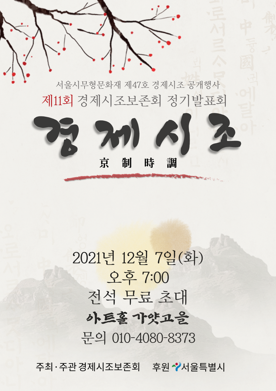 | 서울시무형문화재 제47호 경제시조 공개행사 제13회 경제시조보존회 정기발표회 (0) | 2023.10.21 |