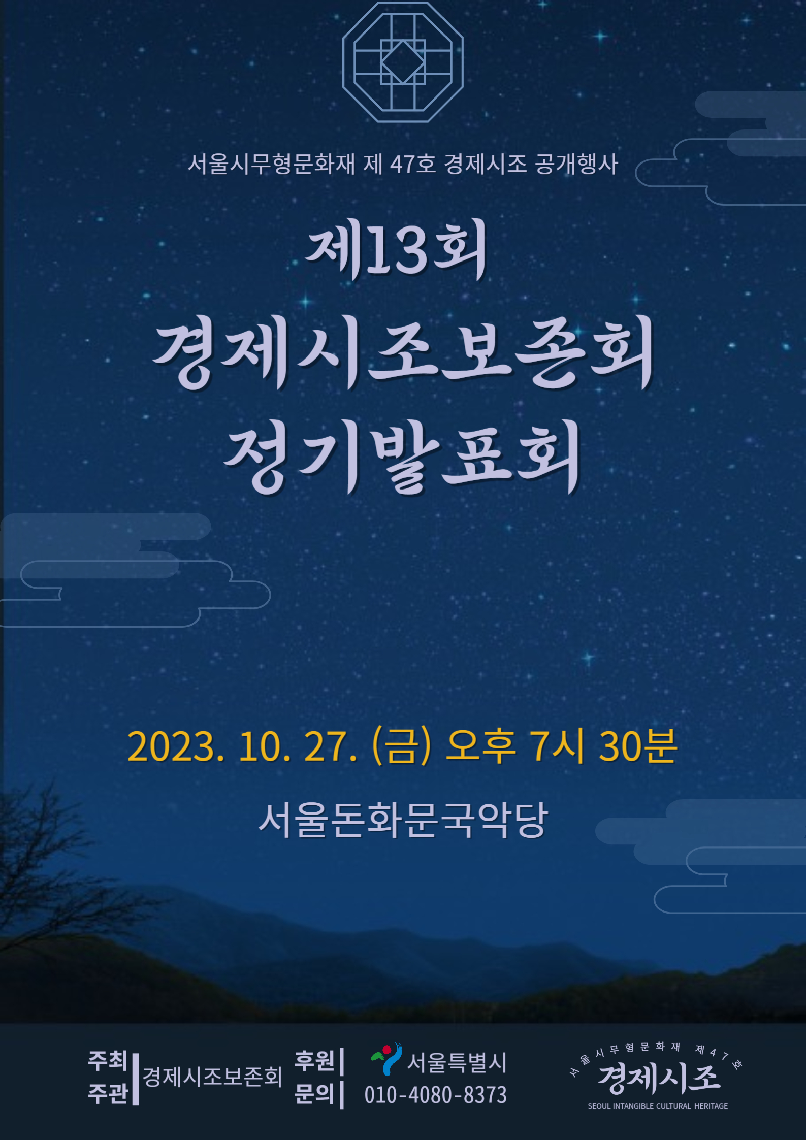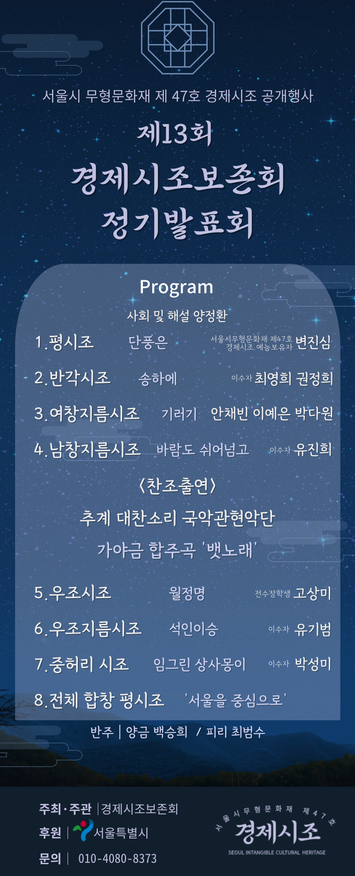 | 서울특별시무형유산 제47호 경제시조 공개행사 제14회 경제시조보존회 정기발표회 (0) | 2024.07.02 |