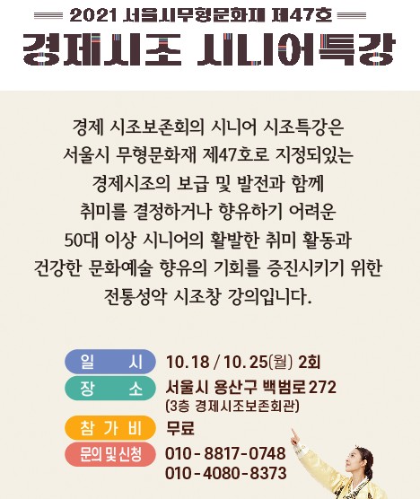 | 2021 서울시무형문화재 제47호 경제시조 하계특강 (0) | 2021.07.25 |