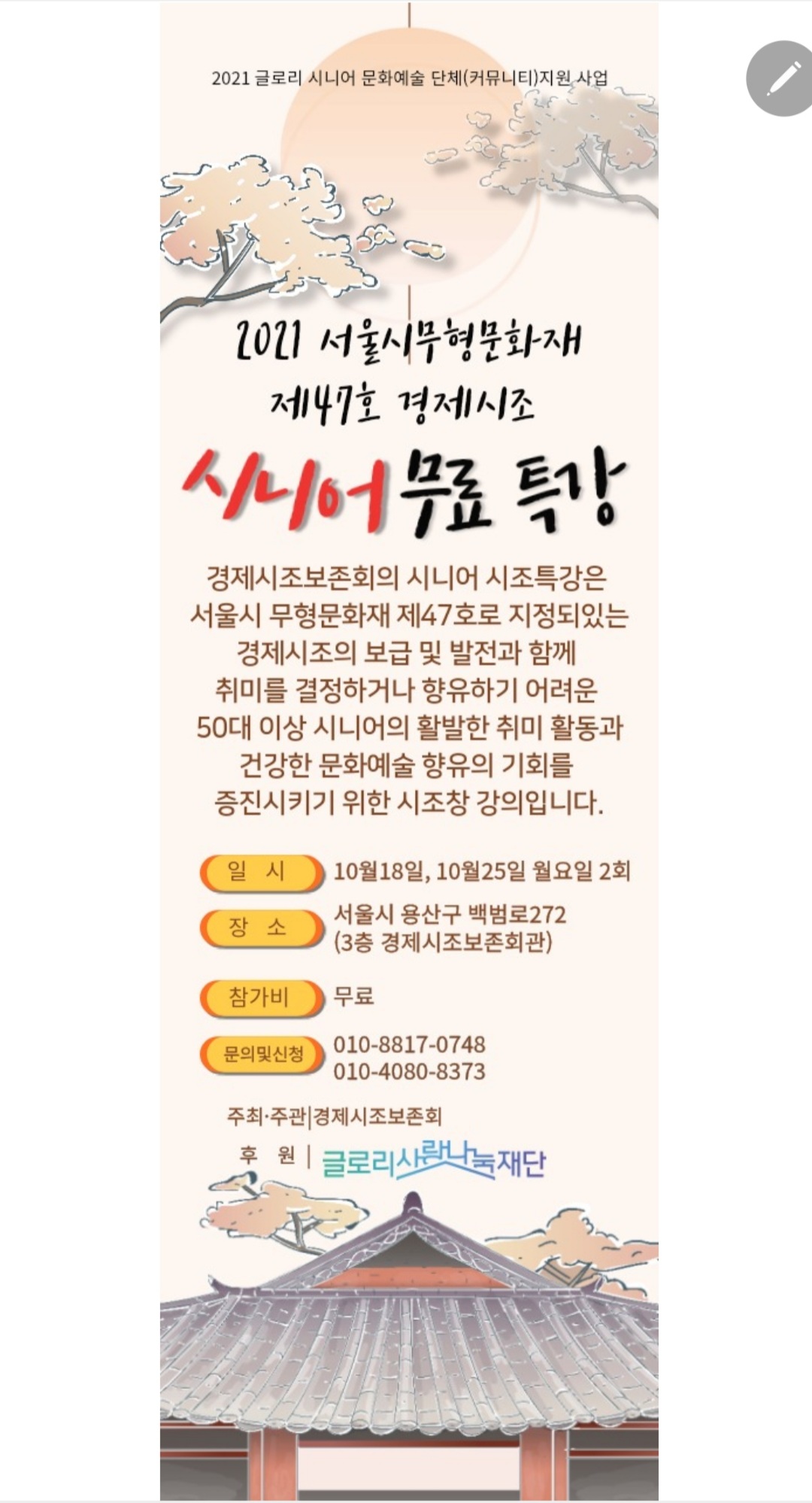 서울시무형문화재 제47호 경제시조 시니어 특강