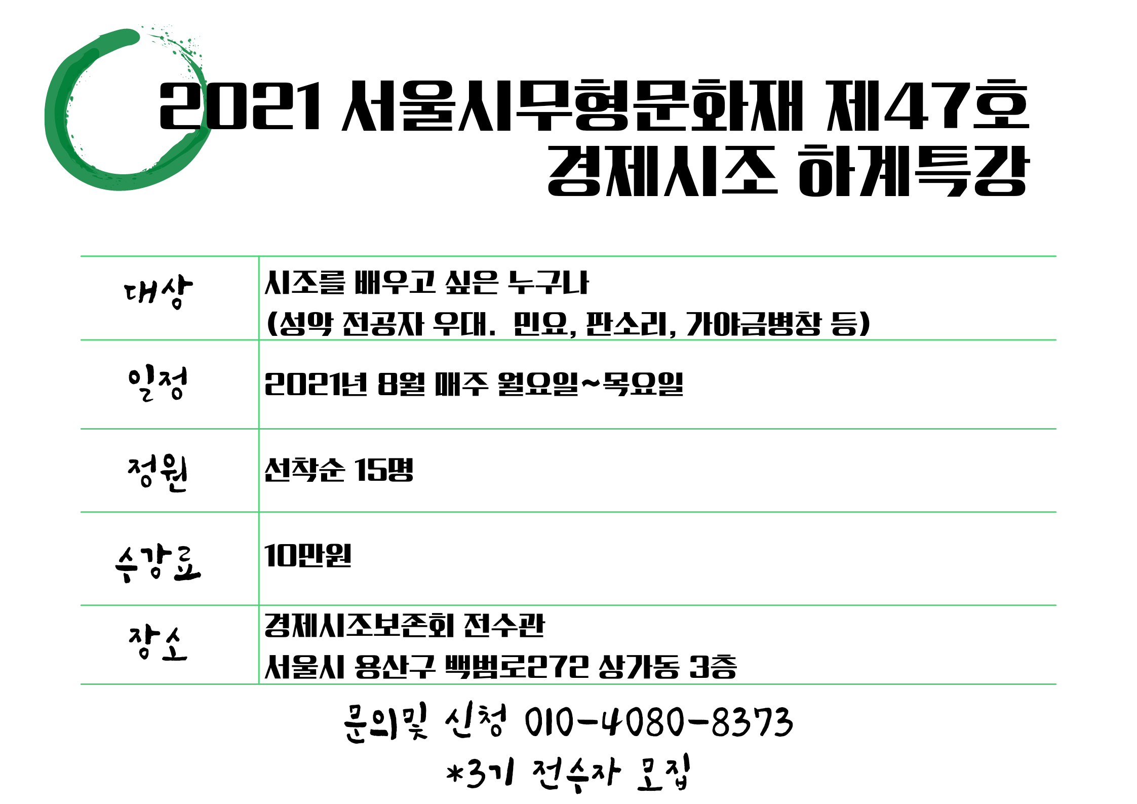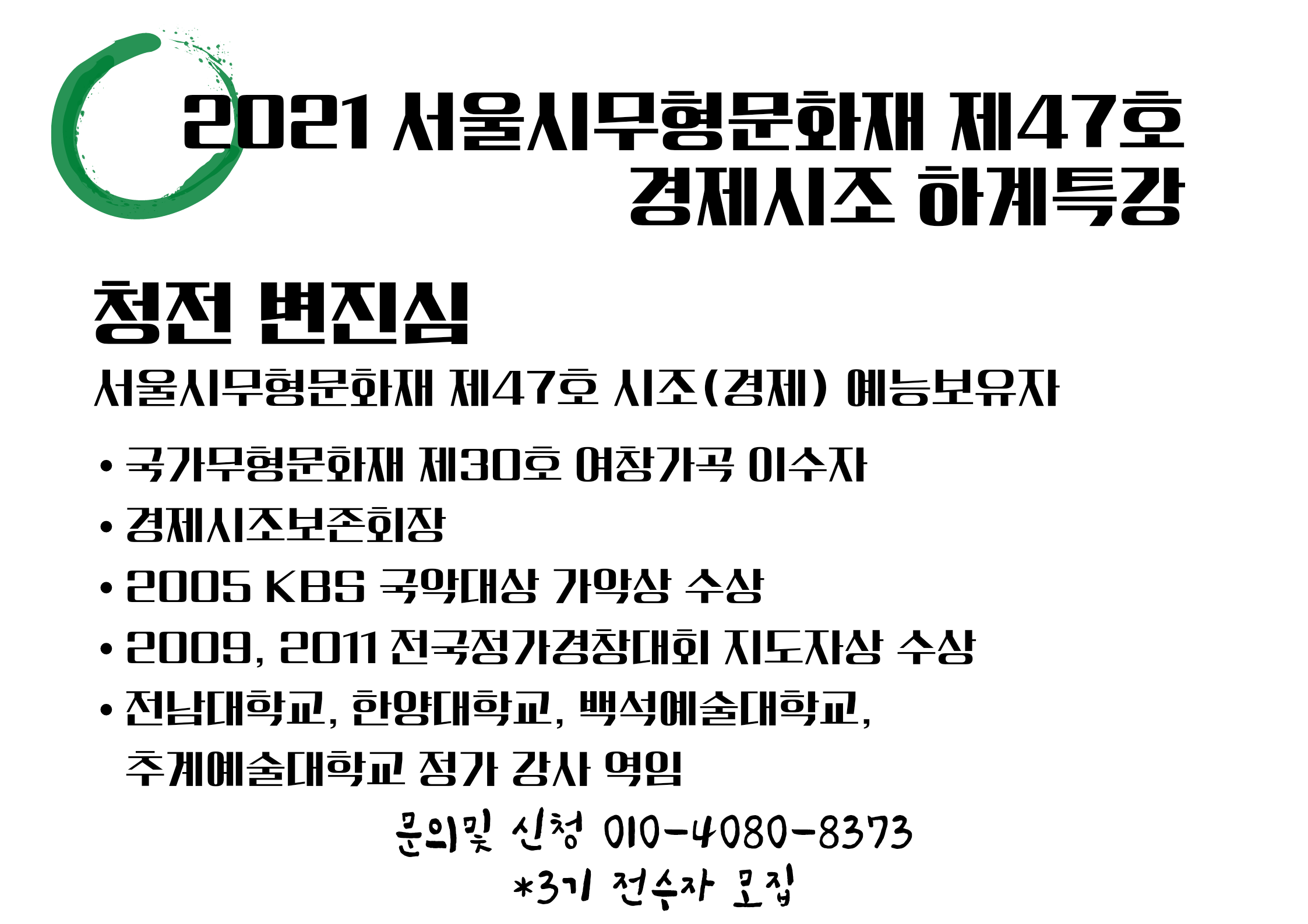 | 서울시무형문화재 제47호 경제시조 시니어특강 (0) | 2021.09.26 |