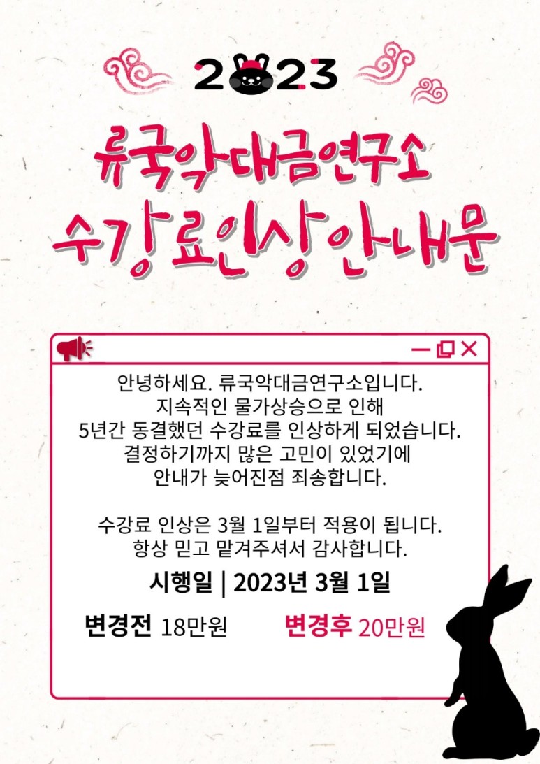 5년간 동결했던 수강료를 일부 인상 하게 되었습니다.